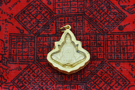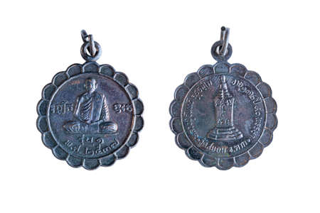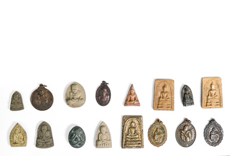 Amulets, Thai Buddha amulet, or votive tablet, made of metal or terracotta isolated on white background. The amulet is popular for Thai people as a tool to help enhance luck in different aspects of life