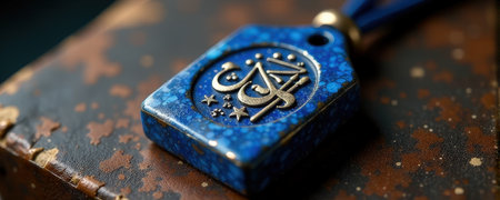 Blue pendant with Arabic calligraphy on vintage book background.