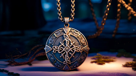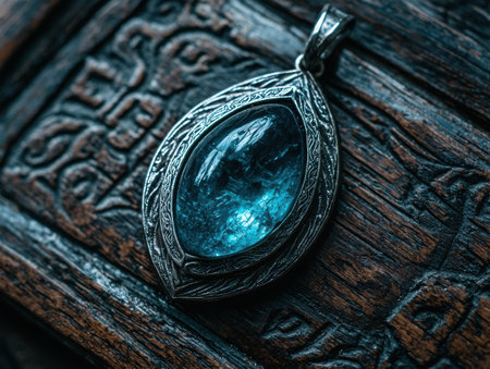 high quality illustration, an enigmatic amulet rests on a weathered wooden table, creating a mystical ambiance with room for accompanying text