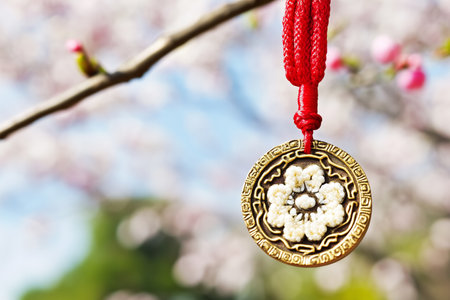 A captivating red pendant featuring a detailed floral design hangs gracefully from a branch of cherry blossoms, symbolizing celebration and beauty during the Asian New Year.