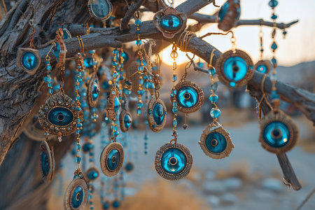Amulets against evil eye hanging on tree