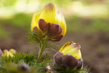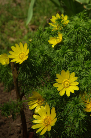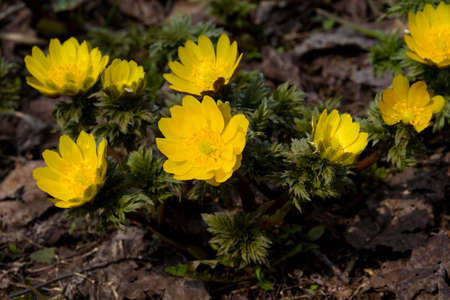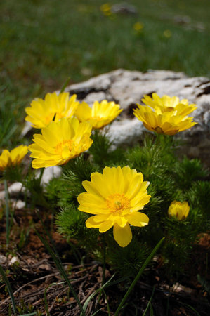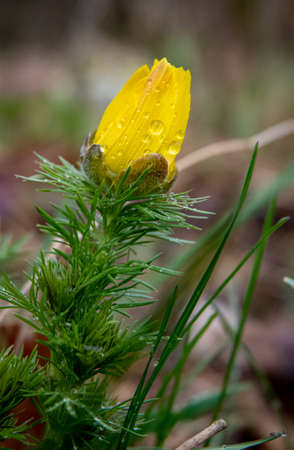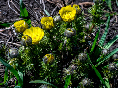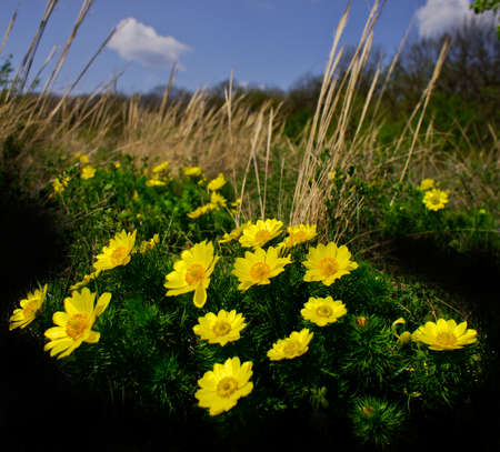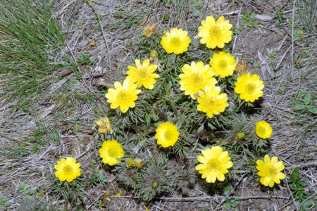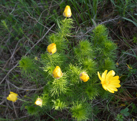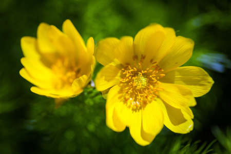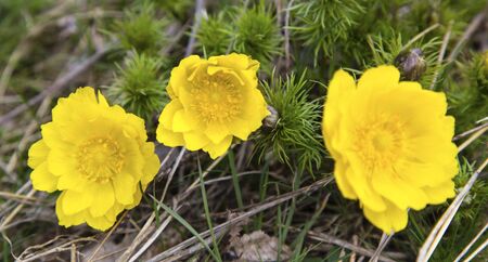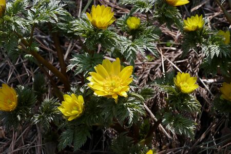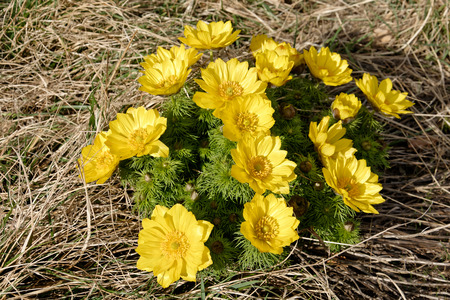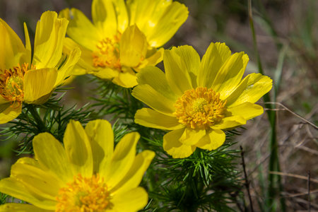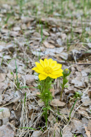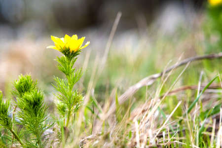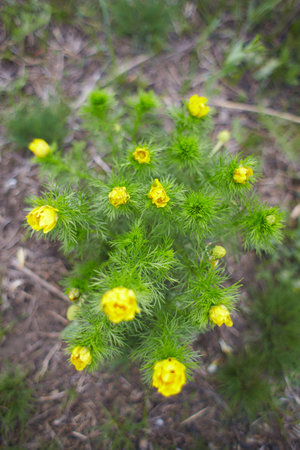 Yellow forest flowers Adonis vernalis, pheasant's eye, spring pheasant's eye, yellow pheasant's eye, false hellebore. The plant is poisonous, containing cardiostimulant compounds.