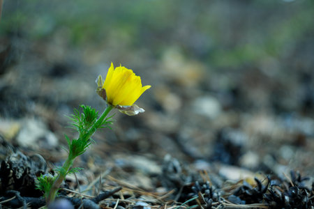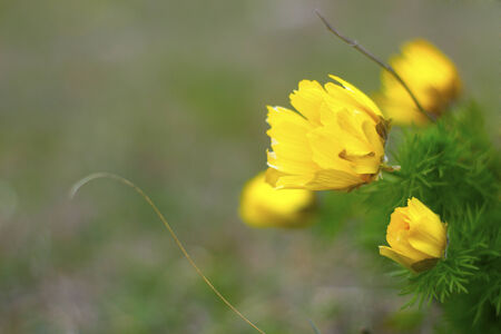 Flowering Pheasant's eye (Adonis vernalis) - selective focus, copy space