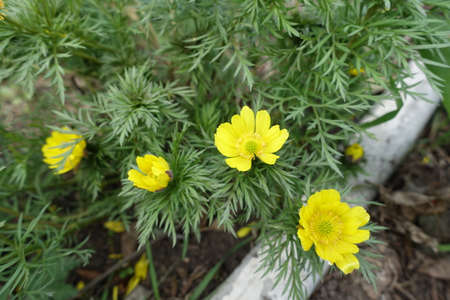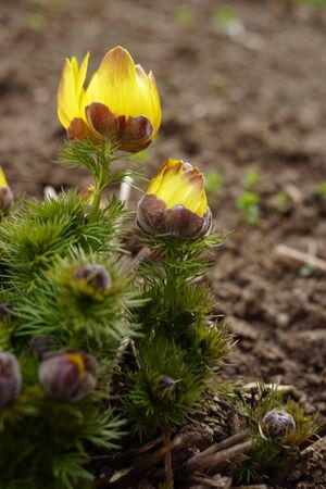 Yellow flowers adonis vernalis grow in the garden. Side view, closeup