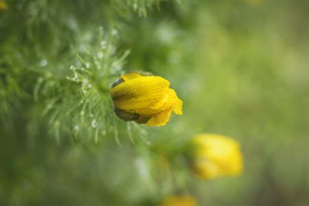 delicate bright yellow flowers of adonis bloom, with the Latin name Adonis vernalis