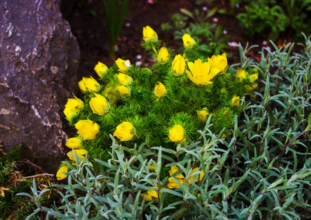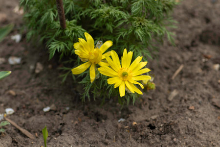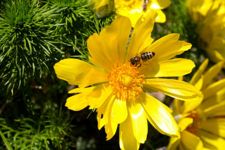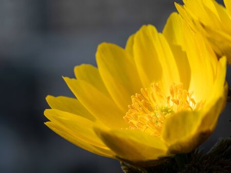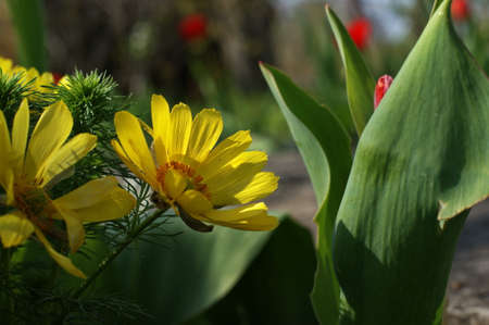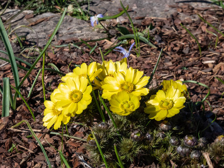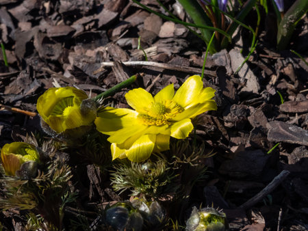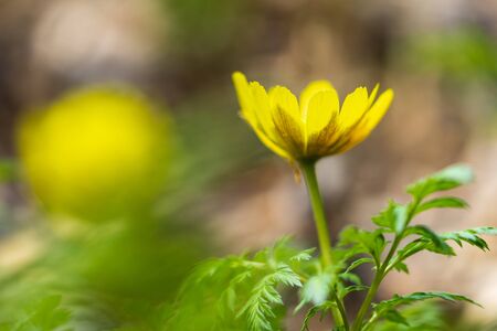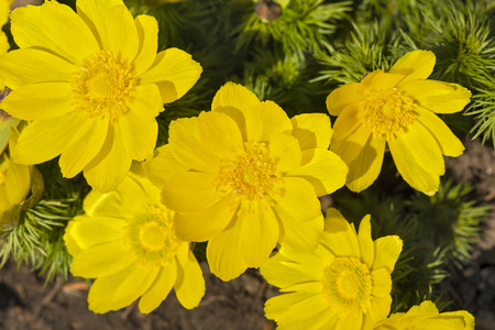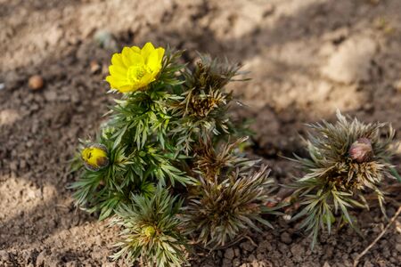 Close-up shot of beautiful spring flowers - yellow pheasant's eyes or false hellebores (Adonis vernalis) growing and blooming in the rock garden in bright sunlight in early spring