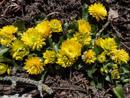 Attractive variety of buttercup (Ranunculus ficaria) 'Plena' with bright yellow and fully double flowers borne amongst deep green waxy leaves early in the spring