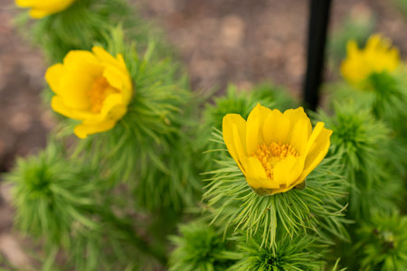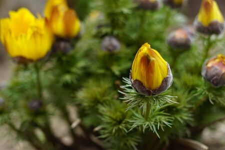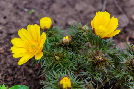 Adonis vernalis is a perennial flowering plant in sping garden. Adonis vernalis is a medicinal plant. Yellow Adonis flowers in natural background.