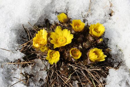 Coltsfoot (Tussulago farfara) flowers in spring, close up shot