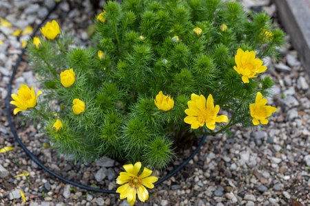 Close-up shot of yellow pheasant's eyes or false hellebores (Adonis vernalis) flowering with yellow flowers in rock garden in early spring