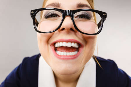 Crazy bizarre business woman or teacher wearing nerd eyeglasses. Female being energetic motivated, wide angle view.