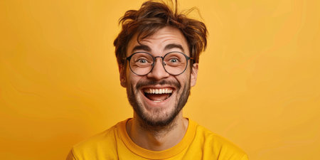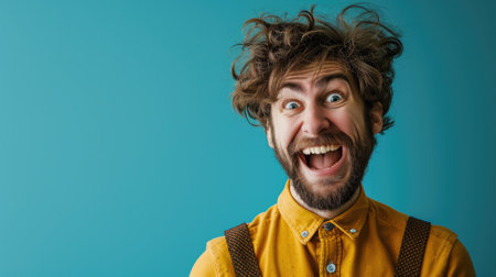 Excited man with messy hair in a yellow shirt against a blue background