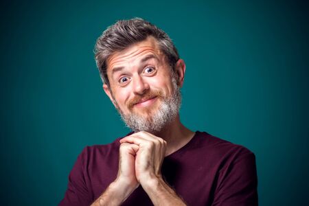 Happy man joy delight emotions blue background thick beard