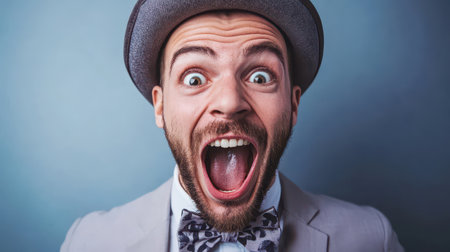 Man in grey suit and bow tie expresses excitement with an open mouth and wide eyes against a blue background during a celebration.