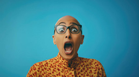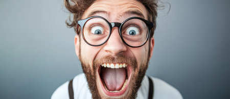 Young man with glasses showing surprised face on a vivid background, expressing emotion, fun, and playful shock.