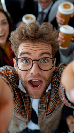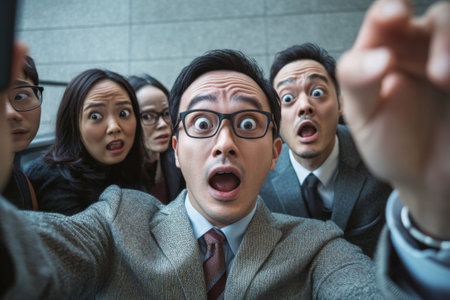 Group of shocked coworkers taking selfie. Surprised people with wide eyes looking at camera in office