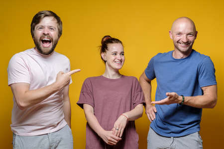 Three friends enjoy a joyful moment laughing heartily together. Their vibrant energy brightens the yellow backdrop creating a lively atmosphere.