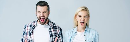 panoramic shot of man and woman shouting isolated on grey