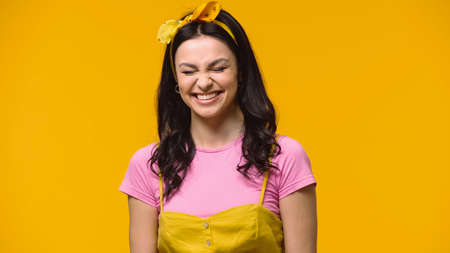 Cheerful woman in headband standing with closed eyes isolated on yellow