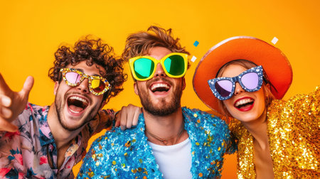 Three friends joyfully celebrate a lively party, wearing colorful, oversized sunglasses and sparkling outfits.