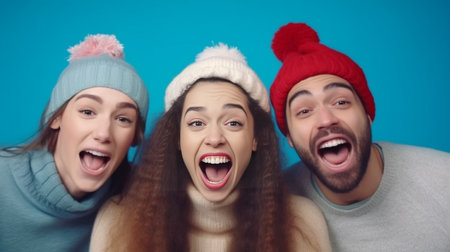 Three people wearing hats and glasses are smiling at the camera, AI