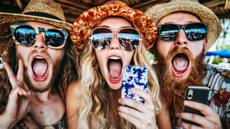 Crazy selfie with funny faces. three people taking self portraits