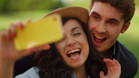 Generative AI : Selfieportrait of funny couple in summer park Friends having fun laughing together People and technology concept