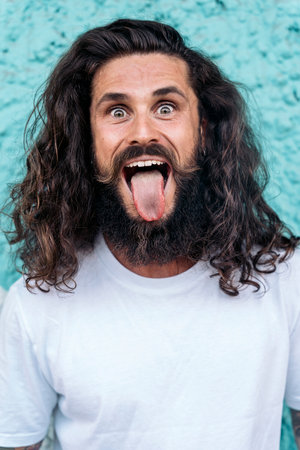 Cool bearded man with long hair sticking his tongue out and looking at camera against blue wall.