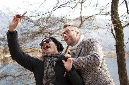 Two friends having fun and making selfie on the lakeshore. Happy faces of friends enjoying weekend in the nature in winter. Winter casual clothing for both. Black jacket and classic coat.
