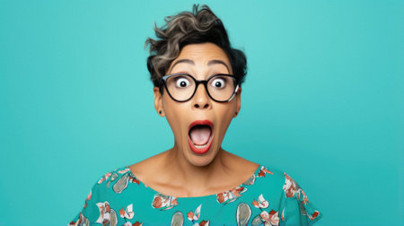 Shocked woman in glasses with open mouth and opened mouth.