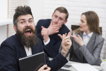 Man with beard on happy face holds laptop, bosses, coworkers, colleagues on background. Successful job interview concept. Man got job, successful meeting. Man surprised, hired for work in office.