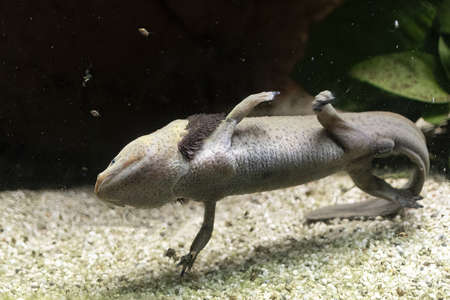 Polypterus delhezi, a species of freshwater fish swimming in the aquarium.