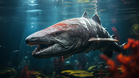 A large fish with its mouth open is swimming in the dark blue water. The fish appears to be in a state of hunger, as it is looking for food. Concept of mystery and intrigue