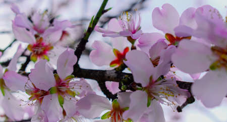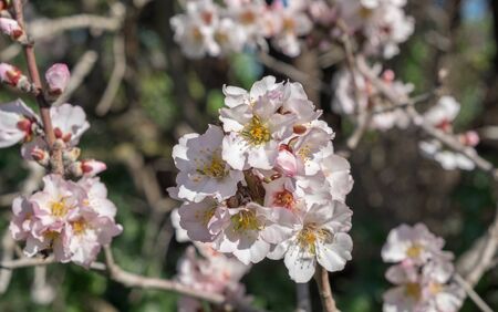 Almond tree blossoms white pinkish flowers blooming in spring