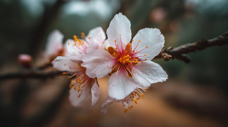 Delicate almond blossoms covered in water droplets sparkle in the soft light
