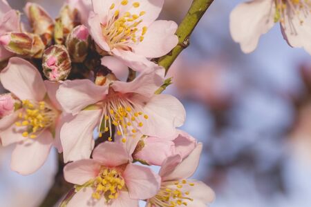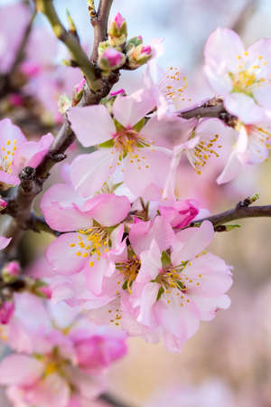 Blooming almond tree brach with flowers in full bloom in springtime in the countryside