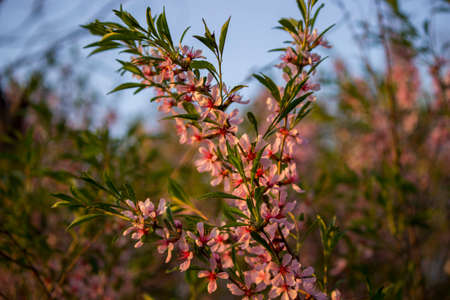 Blooming branch with pink flowers. Close-up. Blooming pink almond bush. Spring background. Pink flowers.