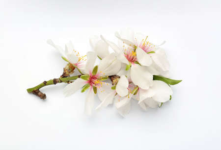 Twig with almond flowers on a white background