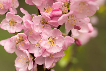 Cherry blossom branches with delicate pink flowers in full bloom during springtime in a garden setting
