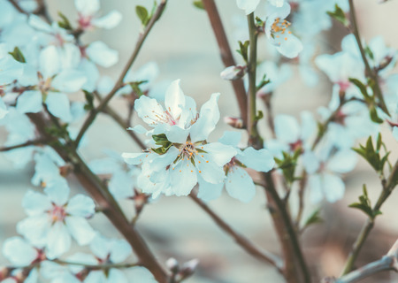 Beautiful branch with almond blossom in a spring garden. Selective focus.