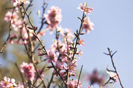 The vernal blooming of an almond tree. Blue sky background, pink flowers