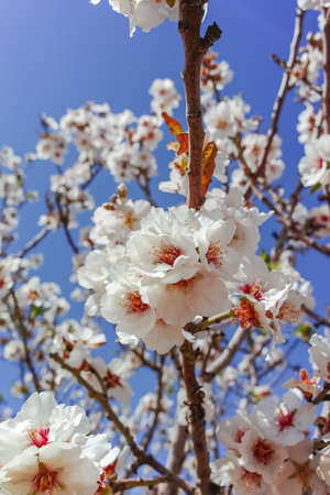 Blossoming of almond flowers in spring time against blue sky, natural seasonal sunny background