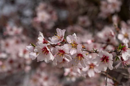 Blooming almond tree branches with flowers in full bloom in springtime in the countryside