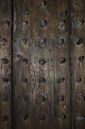 Antique door with wooden plank panels of a rural house, with iron fixing parts, Italy.
