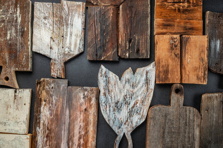 Set Old dark cutting board. Handmade Charcuterie style serving boards. manual work. place for text, top view.