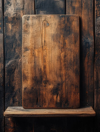 Old wooden cutting board on a shelf on a dark wooden background.