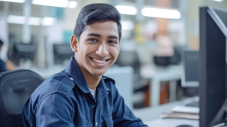 young man wearing uniform smiling at computer, in the style of Indian pop culture