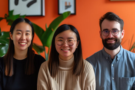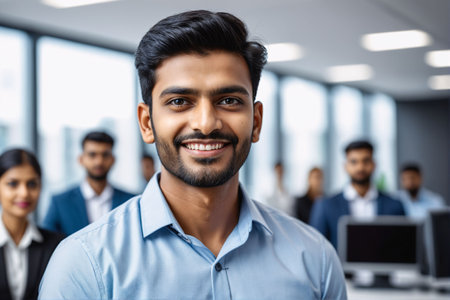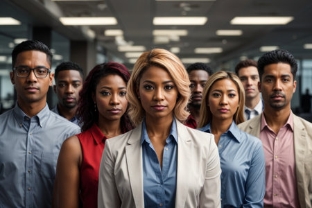 A diverse group of professionals stands confidently in an office environment, dressed in business attire. High quality photo