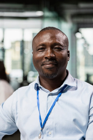 A smiling African male electronic factory worker standing in factory. Generative AI AIG19.