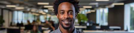 Portrait of a smiling young black man with short hair in a modern cafe setting.